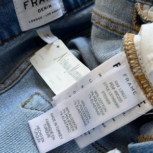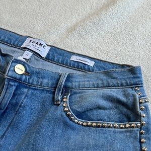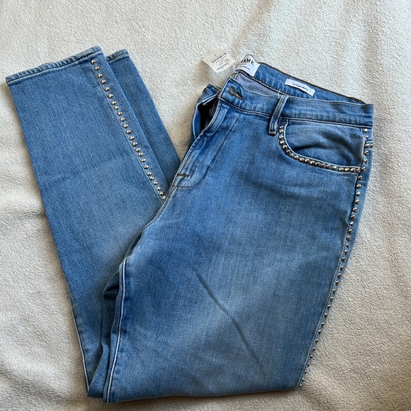 FRAME "Le High Skinny" stud embellished jeans with subtle fading. High rise. Four-pocket style. Fitted through skinny legs. Button/zip fly. Ankle length. Studding goes around pockets, across the back and down side of leg.