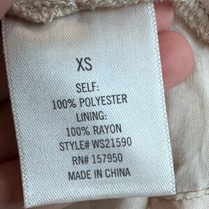 Mi Ami line. 100% polyester with a rayon lining. 3/4 sleeves. scoop neck and back. cream color with a pink hue.