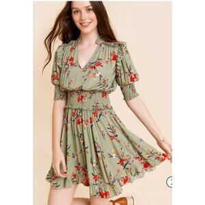 NWT Francesca’s Blue Rain green floral smocked mini dress in size Large. Runs slightly small, Sits right above knees for most.