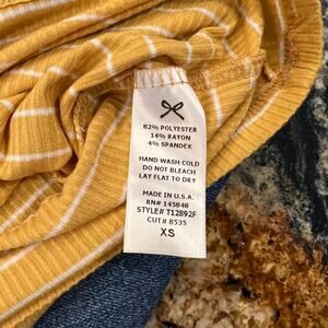 NWT - SIZE XS - This Francesca's Sarah Gold and Cream Striped Long Sleeve Shirt is precious! Ribbed, Long Sleeve with square neck. Color is sunshine - gold and white/cream stripe. 82% Polyester, 14% Rayon and 4% Spandex