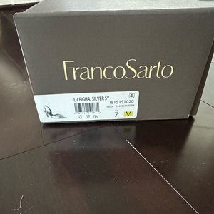 NWT- Franco Sarto Leigha Slingback in silver. Never worn, beautiful shoe can dress up any outfit. Description says heel is 3”. Square toe