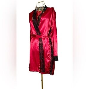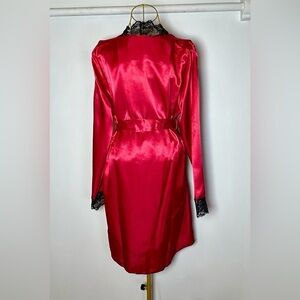 NWT Frederick’s of Hollywood Aspen Mae Red Satin & Black Lace Trim Valentine’s Day Robe with Inside Tie, and Outside Tie Belt with Belt Loops, Size Small.