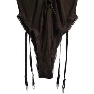 Frederick's of Hollywood, lace-up bodysuit, brown mesh bodysuit, long-sleeve lingerie, women's intimate apparel, crochet trim bodysuit, bodysuit, size M lingerie, Frederick's fashion.