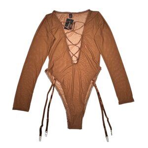 NWT Frederick's of Hollywood Mesh Bodysuit Teddy Sz.M Brown Sheer Garter Sexy