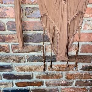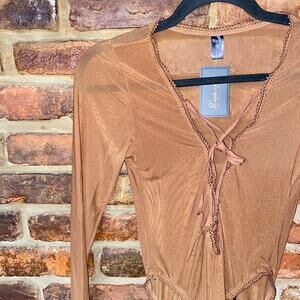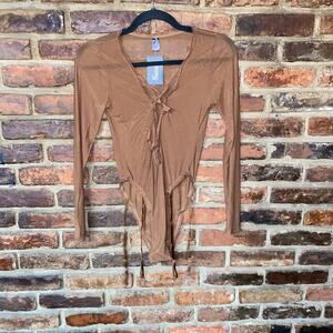 NWT Frederick's of Hollywood Tan Brown Lola Lee Sheer Mesh Long Sleeve Bodysuit Women's Size Medium