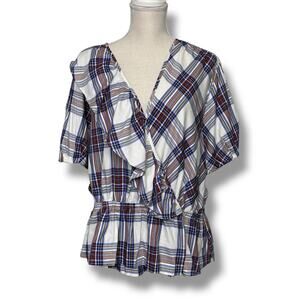NWT Free Assembly White & Blue Plaid Wrap Top w/ Peplum Waist with Ruffle XXXL