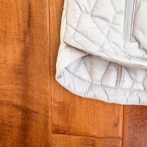Features a diamond quilted pattern and a full-zip front closure, ladies M in gray.