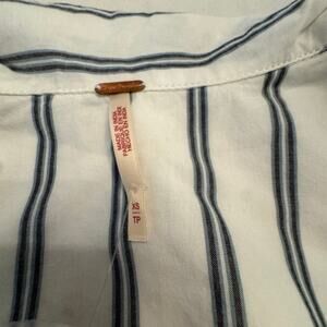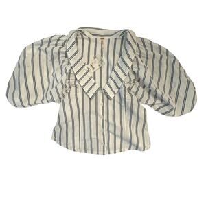 Classic, striped Prairie style boho button-front fit •Defined Chelsea Peter Pan collar. •Puffed dolman sleeves. •Button-front closure with Pearl iridescent buttons •Ties in the back Bust: 36 in Length: 24.5 in Sleeve Length: 14.5 in