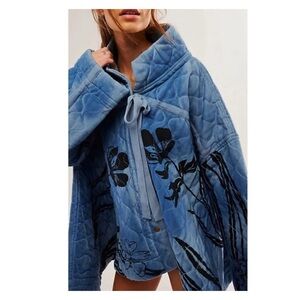 NWT Free People Annie Quilted Sweatshirt Jacket Floral Screen Print Denim Medium