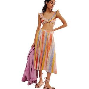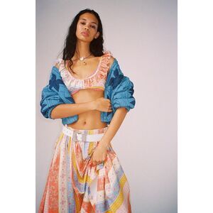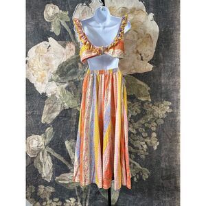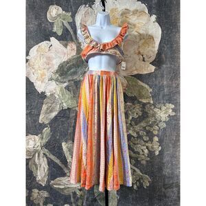 So femme and fun, this colorful set is featured in a playful mixed print fabrication with a minimal bra top and matching mid-rise skirt.