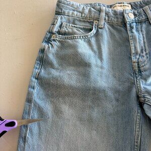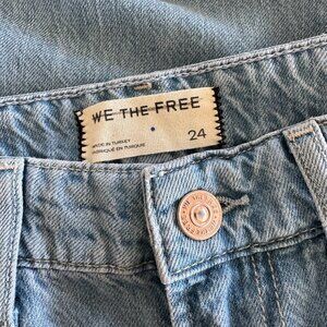 Free People Avalon Drapey flare jeans in light wash denim blue (100% cotton) with relaxed mid-rise / low-rise and soft draped flare leg. From the We The Free collection. MSRP $128. In a size 24, (waist: 12.5 in, rise: 8.5 in, inseam: 30.5 in)