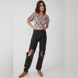 NWT Free People Back On Top Smocked Puff Sleeve Floral Tie Detail Blouse Size S