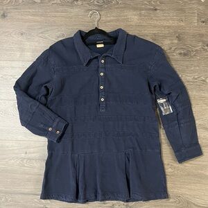 Button-up front closures, collared neckline, soft woven fabrication, pleated hemline for added shape