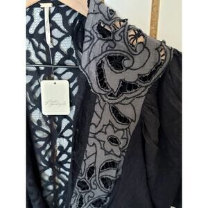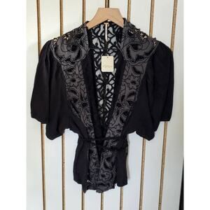Unique beautiful top by Free People in a size large. So lovely in a lace-adorned design, this drapey top is featured in a tie-front, relaxed silhouette with sheer piercing throughout for added dimension. Relaxed, drapey fit.