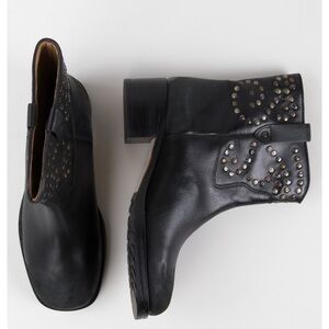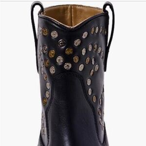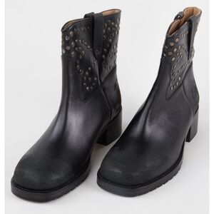 Step out in style with these chic black studded leather boots. Perfect for adding an edgy touch to any outfit. The Harmony boot is offered in black with rustic roughed up detail throughout. Block heel. Studs add shine to this leather boot giving it a great balance between utility and style. Round toe. 3/4” heel. 6” Shaft. Leather upper, sole and lining. Size 9.5. Runs a bit big.. fits well with thick sock. Open to offers. Quick Ship. Great boot! See my pics that depict some of the roughed up spots.
