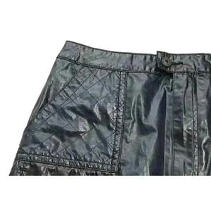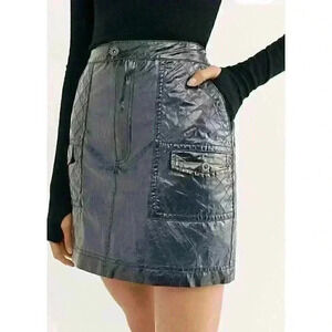 This Free People mini skirt in size 8 is perfect for any casual occasion. The blue faux leather material is accented with quilted details, giving it a bohemian city vibe. The skirt features a button closure and cargo pockets, making it both stylish and functional. The skirt is lined and suitable for all seasons. Its short length and regular size type make it a great addition to any women's wardrobe. Whether you're running errands or going out with friends, this skirt is sure to make a statement.