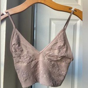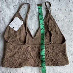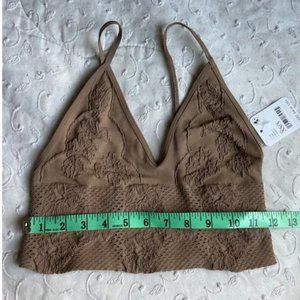 Free People Candy Seamless Bralette. Size XS/S. Color: Sand. Featured in a seamless fabrication, this laser-cut textured bralette features a stretchy design with a v-neckline. Neutral sand color bralette featuring a lace design, longline band, and adjustable straps. Cute and comfortable seamless style to pair under a slouchy sweater or loose v neck t-shirt