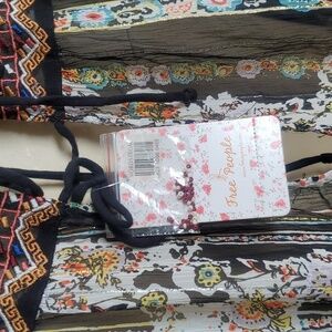 Free People Tunic Size XS Black and Gold with orange, yellow, and blue floral Relaxed fit through bust, waist and hips Semi-sheer tunic or mini dress Square neckline Embroidered neckline with beading 3/4 Sleeve Puffed sleeves that hit above wrists with elasticized cuffs.The fabric is sheer Features a floral print with metallic accents Contrasting embroidered trim Ruffle hem Pullover styling with a tie at the neckline back 💥Reasonable offers welcome 💥BUNDLE DISCOUNT OF 15% WITH 3 OR MORE ITEMS!!,,,,J,,33,,,