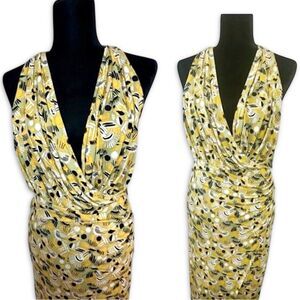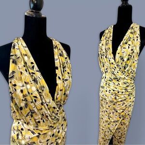 A spirited allover print enlivens this halter maxi styled with soft gathers and a daring stem-showing front vent. Featuring a V-neckline, and a gorgeous T-back.