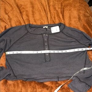 Stylish long sleeve tee by Free People. Features a button-up front. Soft and comfortable fabric. It is new with tags! This is a really cute top, it’s just a little more cropped than I was wanting. Comes from a dog and cat-friendly home.