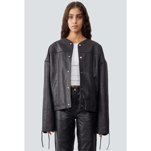 leather jacket, button down, collarless, button up, bomber, oversized, chunky, statement, unique