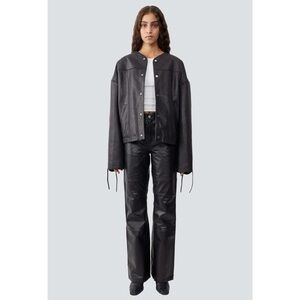 Black Canoo Jacket from Deadwood. This chunky oversized leather jacket features unique leather rope details at the cuffs and sides while two waist pockets and one single inside pocket functionality.