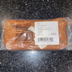 Features: Vegan leather fabrication, worn finish, interior zipper pocket, cash pocket, 6 card slots, zipper closure, attached wrist strap
