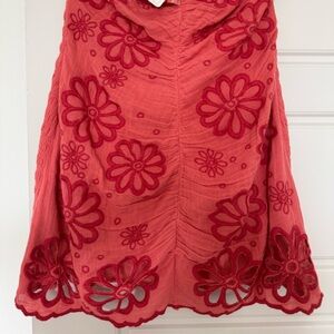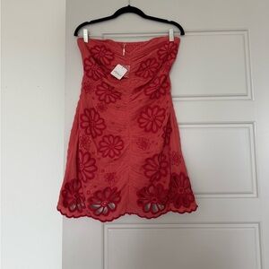 Free People Sizzle Strapless Cotton Minidress, NWT, Size M, Color-Red Clover. Flowery tonal embroidery enlivens this strapless mini punctuated with an airy scalloped hem.