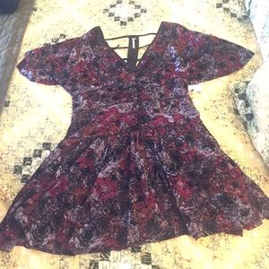 NWT Free People Dress in berry combo, size 10. Fit and flare silhouette with flowy butterfly sleeves. Velvety floral pattern throughout. Paneled for a flattering silhouette. Button down front. Sexy cutout back.
