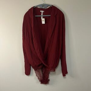 NWT Free People Elsa Deep V Neck Tuxedo Lace Bottom Bodysuit In Terra Cotta Sz M