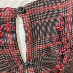 Featuring a sweetheart neckline with flutter sleeves and handkerchief bottom hem, this effortlessly edgy midi dress is perfect in a plaid design with defined floral embroidery throughout for an added special touch.