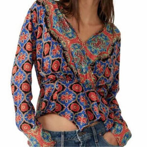 A flouncy peplum punctuates this flowery top designed with a surplice V-neck. A hook and eye keeps the deep V faux wrap style from being too revealing but can be worn unhooked with a tank or cami underneath.