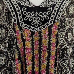 This whimsical Falling Into You long sleeve tunic top/dress by Free People is made of 100% viscose and has embroidery around the neckline and on the back seams that is made of 100% polyester. It has ruffles and is wider at the ends of the sleeves. It can be worn as a mini dress or with shorts or jeans.