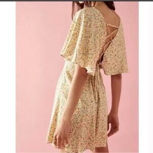 Step into spring and summer with this beautiful NWT $128 Free People Florence Mini Dress in a vibrant ivory yellow color. The dress features a round neckline, flutter sleeves, and lace-up closure, all adorned with delicate floral patterns that add a touch of bohemian and peasant vibes. The dress is perfect for any occasion, from casual outings to weddings and parties, and is made of viscose material that is both comfortable and machine washable.