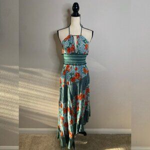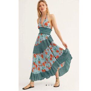 A stunning bohemian-inspired midi that brings color, comfort, and effortless style into one eye-catching silhouette. Featuring a rich patchwork floral print in vibrant shades of blue, teal, red, and burnt orange, this dress radiates carefree summer energy. Offers a soft, flowy drape that moves beautifully with every step. The halter neckline ties at the back, allowing for an adjustable fit while creating an open-back detail that adds a flirty edge. A gently ruched, smocked waist cinches the midsection for a flattering shape, while the asymmetrical hemline—slightly high-low—adds a breezy, ethereal touch.