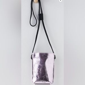 Perfectly petite for easy carrying, this fun crossbody bag is featured in a glittering metallic to catch all the light and all the stares.
