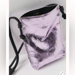 Features: Crossbody style, metallic leather fabrication, pouch design, leather shoulder strap with slide adjuster, snap button closure