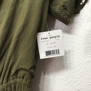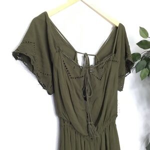 A double layered brand new shorts romper. Elastic waist with adjustable front and back strings. Low cut front and back. With fun details around all the edges and tassels on the front strings. I’m not 100% sure if it’s part of the design or a stain, but a few dots are on the front leg side (last picture).
