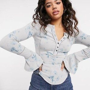 NWT Free People Grey Floral Ribbed Henley Long Bell Sleeve Boho Top S