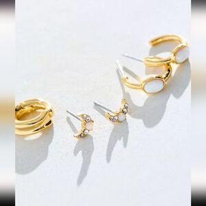 Features: Gold-plated, 1 pair of mini hoops with opal detail, 1 pair of mini moon studs with CZ inlays, ear cuff.