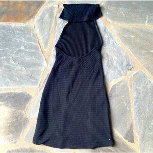 Features: Oversized turtle neckline, ribbed fabrication, sultry open back, dropped armholes