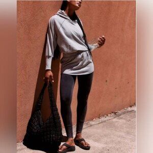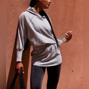 Free People X FP Movement Tunic in heather grey. It is a casual, relaxed-fit tunic with a hooded neckline, long sleeves, and a cinched, elasticized waist. The tunic is made of fleece fabric and has a pull-on style. It is designed to be worn as a comfortable, everyday piece, suitable for layering over workout clothes or pairing with jeans or skirt