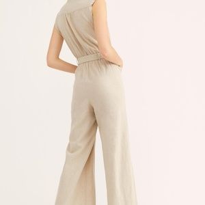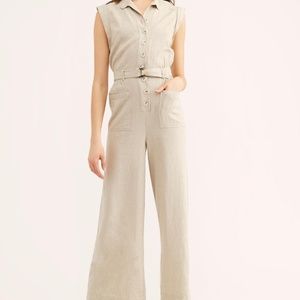 Free People Hot Shot Jumpsuit Oatmeal Natural Linen Size Medium Button Belt 2471
