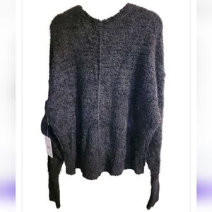 Free People sweater, eyelash fuzzy knit, black v-neck sweater, slouchy oversized pullover, soft cozy sweater, women’s fall fashion, winter layering piece, chic casual top, new with tags, long sleeve knit