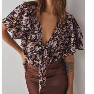 ● A soft, effortless floral paisley print bodysuit featuring in a surplice design with a tie front detail and tiered ruffled short sleeves silhouette with a plunging neckline.