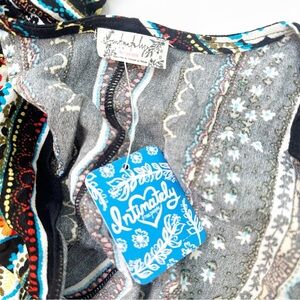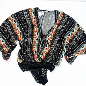 So boho printed bodysuit featured in a surplice style with billowing long sleeves and a lace-up neckline.