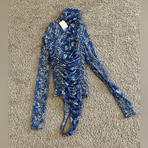 Chic blue floral bodysuit. Sheer design with long sleeves. Perfect for layering.