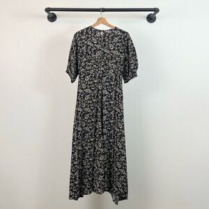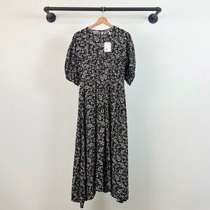 NWT Free People Jessie Puff Sleeve Floral Handkerchief Hem Midi Dress Black