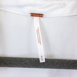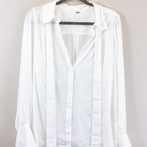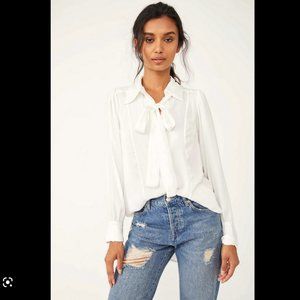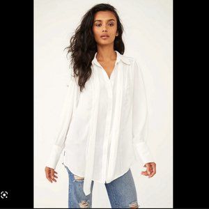A true staple in any closet, this stunning button-down is featured in a relaxed silhouette with tie detail at the collar and covered button closures at the sleeves for the perfect finishing touch* Pleated detailing throughout* Curved bottom hem* Tie can be worn at neckline or waist