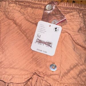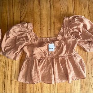 This top by Free People features exaggerated sleeves, pleating at bottom for added shape and dimension, boxy and slightly cropped fit, square neckline, button-front detailing, and babydoll inspired silhouette.